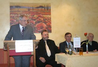 Dr. Manfred Unglaub (KV EAK) stellte die ereignisreiche Biografie Johannes Gersters und seine segensreiche Tätigkeit im Nahen Osten dem zahlreich erschienenen Publikum vor. Von links: Dr. Unglaub, Johannes Gerster, der ehemalige Landtagspräsident Dr. Volkert (Vorsitzender der Peter-Altmeier-Gesellschaft), Dr. Heinz Kahn.