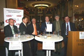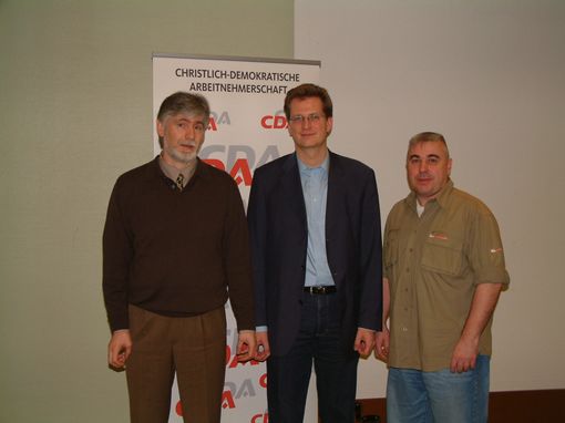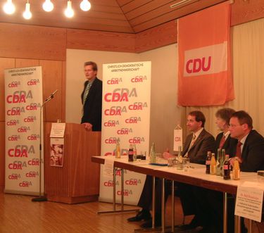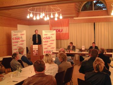 Unter diesem Arbeitstitel wird Dr. Ralf Brauksiepe (unten, Mitte; rechts: Ekkehard Gauglitz, CDA-Bezirksvorsitzender), MdB, Sprecher der CDU/CSU-Bundestagsfraktion für Arbeit und Soziales und CDA-Landesvorsitzender von Nordrhein-Westfalen im Rhein-Lahn-Kreis referieren