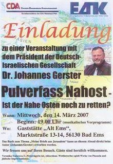 Mittwoch, 14. März 2007, 19.00 Uhr ~ "Alt Ems", Marktstraße 13/14, Bad Ems ~ Referent: Dr. h. c. Johannes Gerster, Präsident der Deutsch-Israelichen Gesellschaft, langjähriger Leiter des Jerusalemer Büros der Konrad-Adenauer-Stiftung