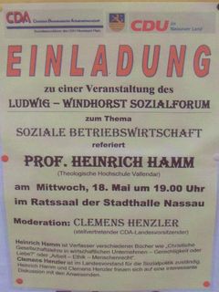RHEIN-LAHN. Großes Interesse fand die Veranstaltung des Ludwig-Windthorst-Sozialforums zum Thema "Soziale Betriebswirtschaft", welche die CDA Rhein-Lahn sowie der Gemeinde-verband CDU im Nassauer Land organisiert hatten. Als Referenten standen mit Prof. Heinrich Hamm (Theologische Hochschule Vallendar) und dem Unternehmer Robert Wolff (Seniorchef der Firma wolff-craft) nahmhafte Fachleute Rede und Antwort. CDA-Kreisvorsitzender Martin Gerhardt gab nach einleitenden Worten das Wort an Prof. Hamm, der in seinem Referat die in der christlichen Gesellschftslehre gründenden theoretischen Voraussetzungen für eine "Sozi- ale Betriebswirtschaft" darlegte. Prof. Hamm überzeugte in seinen Ausführungen mit wissen- schaftlicher Präzision und staunenserter Klarheit, so Kreisbeigeordneter Helmut Klöckner in der anschließenden Diskussion.
