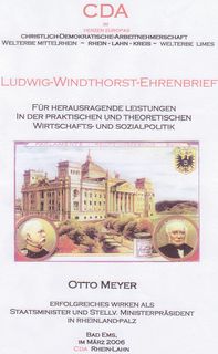 Für sein erfolgreiches Wirken als Staatsminister und stellver-tretender Ministerpräsident in Rheinland-Pfalz erhielt Otto Meyer, Herold, den Ludwig-Windthorst-Ehrenbrief anläßlich seines 85. Geburtstages (2006). Diese Auszeichnung erhielt auch der leider zu früh verstorbene langjährige Staatsminister in Mecklenburg-Vorpommern und Rheinland-Pfalz, unser CDA-Kollege Rudi Geil