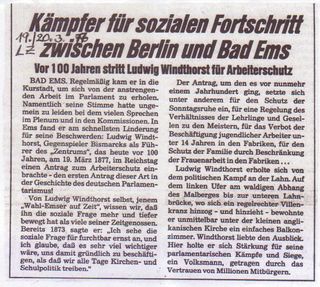 Bedeutendster Parlamentarier des 19. Jahrhunderts, Gegenspieler Bismarcks, Gründer des auf das Ge-meinwohl ausgerichteten "katholischen Volksver-eins", 16 Jahre Emser Sommergast, förderte als Zen-trumsführer die Sozialpolitik Georg von Hertlings (1. Präsident der Görresgesellschaft, 1843 - 1919) und Franz Hitzes (1851 - 1921)