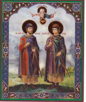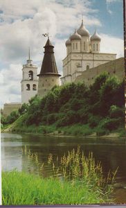 Oben: Die auf die Großfürstin Olga zurückzuführende Dreifaltigkeits-kathedrale von Pskow. Bei der Familie Belozerkowskij zu Gast, habe ich mehrmals den Kreml mit der Kathedrale und meinen "Freund", den hl. Seraphim, das Miroschkloster und etliche Kirchen besucht, um dann zweimal die Gastfreundschaft des berühmten Pskower Höhlenklosters zu erfahren und mit dem dortigen Starez zu sprechen. Unten die ersten rus-sischen Heiligen Boris und Chleb.