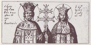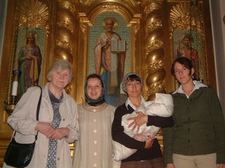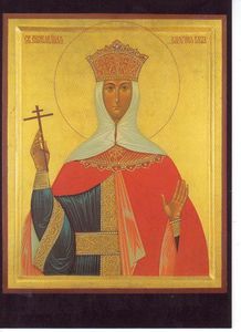 Die erste Christin im Kiewer Altrußland, die wir mit Namen kennen, ist die Fürstin Olga von Kiew (im Hintergrund links, Hl. Nikolaus, Hl. Konstantin). Daß es schon früher, um das Jahr 945 mindestens eine christliche Pfarrei in Kiew gab, bezeugt uns die älteste russische Chronik, die sogenannte "Nestorchronik". Sie berichtet, wie 944/45 ein Handelsvertrag zwischen Griechen und der Rus geschlossen wird und von den Christen in der Kirche des hl. Elias beschworen wird. Und die Chronik fügt hinzu: "Dies war die Hauptkirche des Ortes. Es waren nämlich viele Waräger Christen. Olga war schon als heidnische Fürstin wegen ihrer Klugheit bewundert und verehrt, wenn sie auch von "Belehrung" ihrer Gegner, des ostslawischen Stammes der Derewljanen, durch grausame Kriegslisten nicht zurückschreckte. Diese wollten allerdings Olgas Witwenschaft und das zarte Kindesalter ihres Sohnes Svatoslav ausnutzen, um die Herrschaft in Kiew und über die Rus an sich zu bringen. Die "Nestorchronik" berichtet Bekehrung und Taufe Olgas (in der Hagia Sofia, Konstantinopel in Anwesenheit des Kaisers durch den Patriarchen, unten)unter dem Jahre 955. Sie wurde auf den Namen Helena (rechts unten) getauft, der Mutter Konstantins.