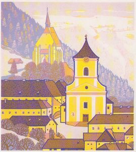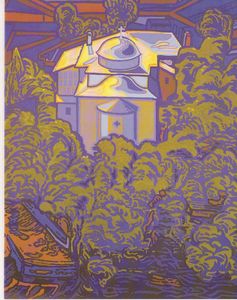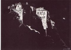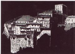 Abt Aimilianos (+) vom Athoskloster Simonos Petras, Linolschnitt von Reinhard Zwerger. Rechts das Haus der Ikonenmalermönche Johannes & Antonios, Kafsokalyvia, Berg Athos.