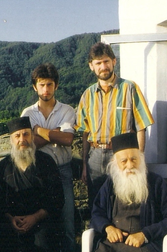 Ikonenmaler Kosmas und Meletios o Sikiotis (Karies, Berg Athos) mit Ikonenmalschüler und Martin Gerhardt