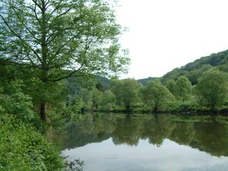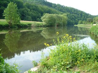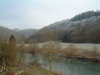 Blick von der Geilnauer Seite zum anderen Ufer. Dort durchquert die Lahntalbahn den Cramberger Crampen per Tunnel.Unten: Zugefrorene Lahn imWinter.