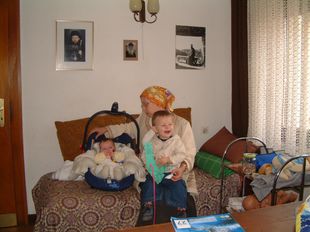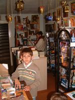 Sascha kennt sich bereits aus im Klosterladen. Andreas, Helena und Johannes auf dem "Kinderbesuchersofa"