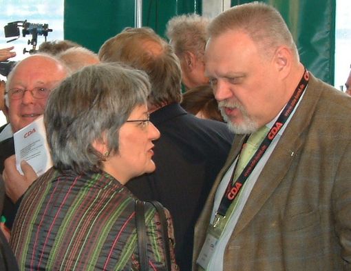 DGB-Vize Ingrid Sehrbrock im Gespräch mit dem KAB-Bundesvorsitzenden Georg Hupfauer - dahinter verschmitzt lächelnd: Nobbi Blüm