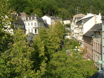 Das Eingangstor zur Hinnergaß - der Grabenstraße - bildete bis in meine Kindheit das Haus "Zur Sonne" (unten- dahinter ein labyrhintisches System zur Auf- und Weiterleitung der verschiedenen Mineralwasser) zur linken mit dem sogenannten "Steinernen Haus" (Zeichnung oben) und angrenzendem "Hotel Löwen". In einem barbarischen Akt wurden sie ebenso wie der dahinter- liegen- de "Weilburger Hof" und die Häuser "Taube" und "Täubchen", später das Haus "Normandie" für den sogenannten Fortschritt abgerissen. Rechts in der Bäder- lei kann man das Rondell mit dem von den Amerikanern in den letzten Tagen des 2. Weltkrieges zerschossenen Kriegerdenkmals ansatzweise erkennen.
