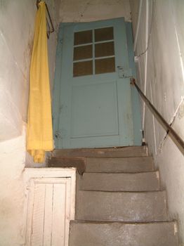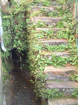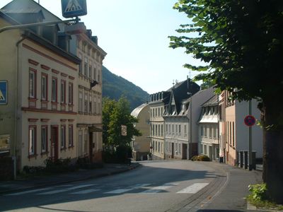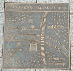 Blick schräg gegenüber in den "Pfahlgraben", der im Namen den Verlauf des römischen Limes anzeigt - unten Kellertreppe im unveränderten Zustand. Links das Gebäude der ehemaligen Pastillenfabrik, dessen abgerissener Schornstein einst das Straßenbild mitprägte. Zu ihr gehörte auch die beseitigte Versandhalle (Mainzer Straße) für das weltbekannte "Emser Wasser", welches heute aus marktstrategischen Gründen zum Vorteile des Fachinger Wassers nicht mehr vertrieben wird. Darunter Tafel, welche den Verlauf des Limes im Bad anzeigt.