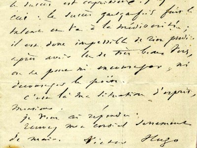 Oben: Manuskript "Der Glöckner von Notre Dame" (darüber Kathedrale Notre Dame de Paris); darunter: Haus in dem Hugo starb - in der heutigen Rue de Victor Hugo", Paris; Unten: Besancon: Geburtsstadt in Frankreich